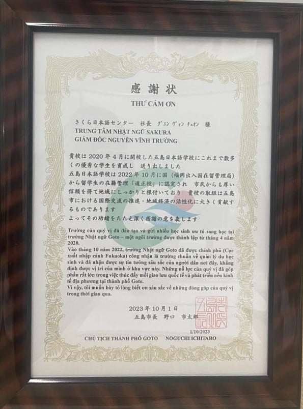 Thị trưởng Thành phố Goto, gửi thư cảm ơn Trung tâm Nhật ngữ Sakura đã đào tạo và gửi nhiều học sinh sang học tại trường Nhật ngữ Goto. Trong đó, có những học sinh ưu tú, đã thi đậu và nhận học bổng 100 %, một số bạn khác cũng nhận được học bổng 50 %…